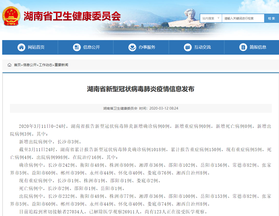 荔枝新闻讯 2020年3月11日0-24时,湖南省报告新型冠状病毒肺炎新增确诊病例0例,新增重症病例0例,新增死亡病例0例,新增出院病例3例。其中: