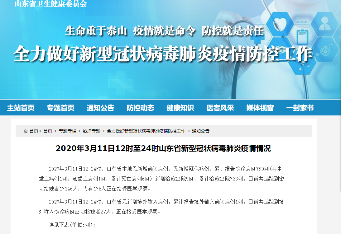 荔枝新闻讯 2020年3月11日12-24时,山东省本地无新增确诊病例,无新增疑似病例,累计报告确诊病例759例(其中,重症病例1例,危重症病例1例,累计死亡病例6例);新增治愈出院9例,累计治愈出院733例。目前共追踪到密切接触者17146人,尚有178人正在接受医学观察。