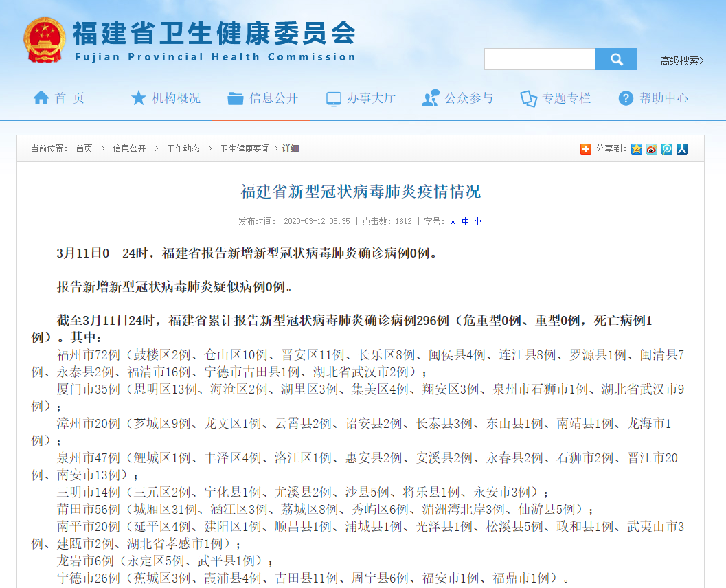 截至3月11日24时,福建省累计报告新型冠状病毒肺炎确诊病例296例(危重型0例、重型0例,死亡病例1例)。其中: