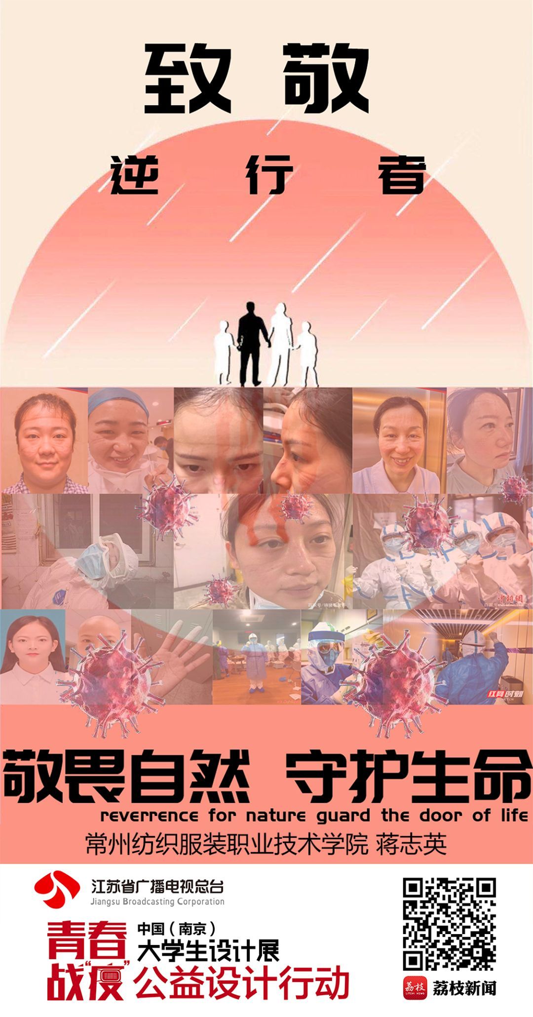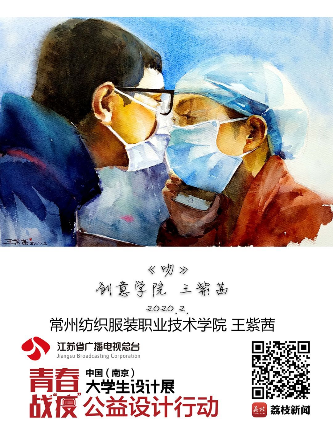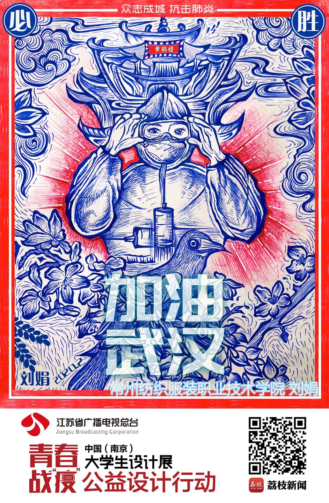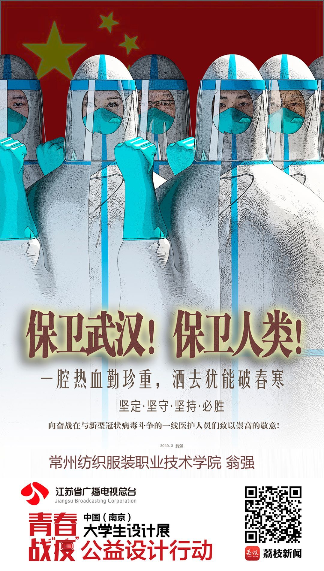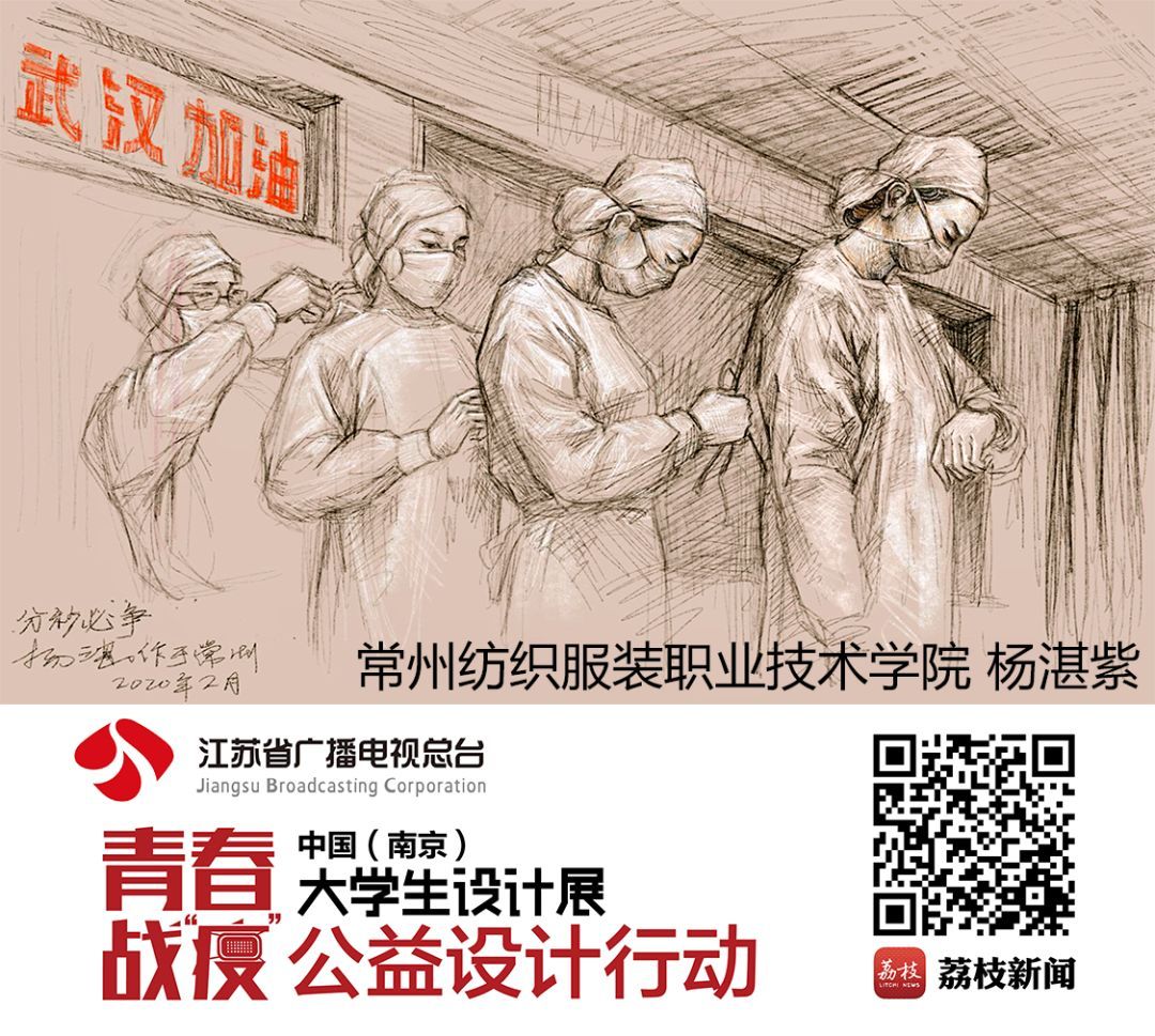 医生周身发出光芒,驱散黑暗,给患者带去温暖。医生背后是象征武汉的黄鹤楼,下方绽放的樱花象征春天来临,表达了必胜的信念。