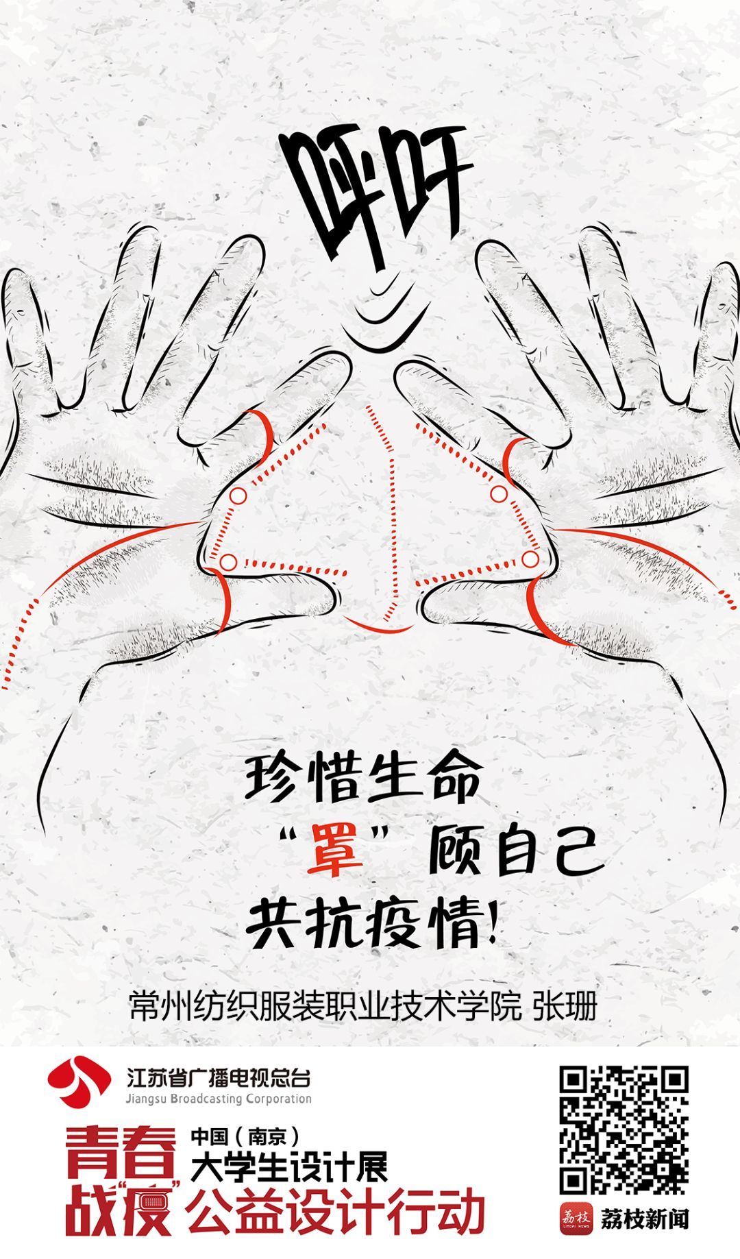 海报主体是摆出“呼喊”手势的一双手,两手间的空隙形成口罩的形状,口罩带子的红绳与掌心的生命线连接在一起,暗喻口罩关乎生命,呼吁大家自觉戴口罩。