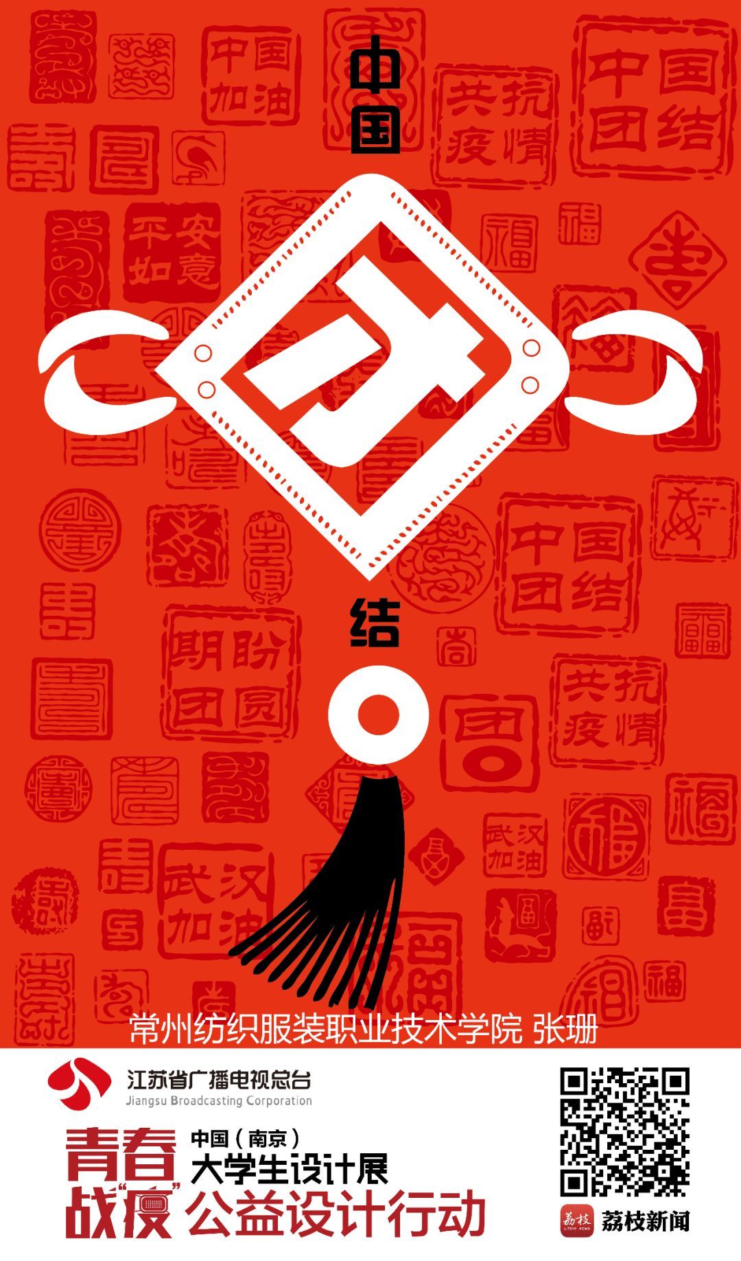 中国结象征吉祥如意,在图中寓意疫情尽快消退。中国结造型与“中国团结”字样结合,又象征全国人民团结一致。“团”字变形“口罩”,点名“战‘疫’”主题,而圆型平安扣,又代表“团圆”的“圆”字,希望医护人员与家人早日团聚。