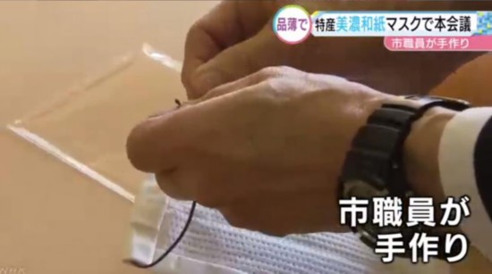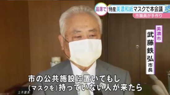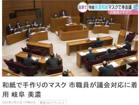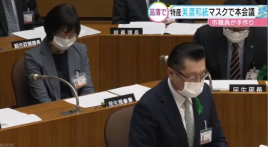 报道称,12日当天,以美浓市市长武藤铁弘为首,共有约20名政府干部职员佩戴着用当地特产和纸自制的口罩进入议会会场。