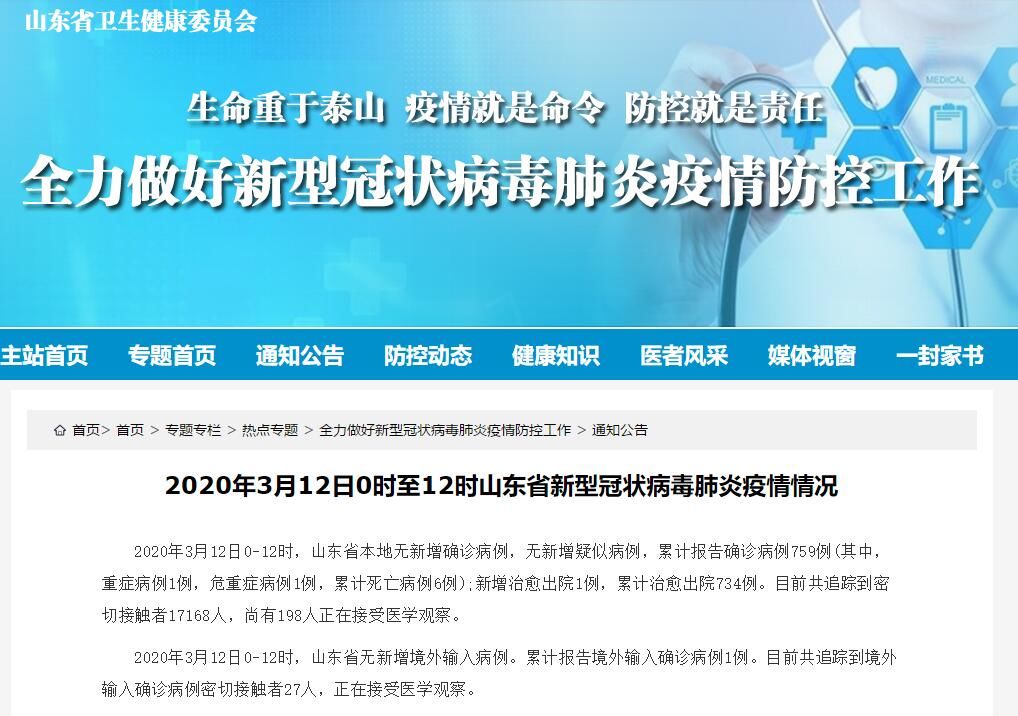 荔枝新闻讯 据山东省卫健委消息,2020年3月12日0-12时,山东省本地无新增确诊病例,无新增疑似病例,累计报告确诊病例759例(其中,重症病例1例,危重症病例1例,累计死亡病例6例);新增治愈出院1例,累计治愈出院734例。目前共追踪到密切接触者17168人,尚有198人正在接受医学观察。