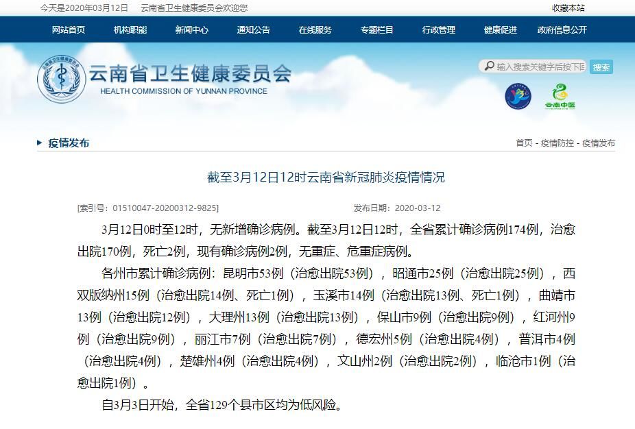 荔枝新闻讯 据云南省卫健委消息,3月12日0时至12时,无新增确诊病例。截至3月12日12时,全省累计确诊病例174例,死亡2例,现有确诊病例2例,无重症、危重症病例。