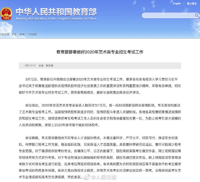 会议要求,各地各高校要精心做好宣传解读工作,省级招生考试机构要积极宣传相关考试和录取政策,高校要及时发布招生简章和相关考试时间安排,让考生和家长充分知晓。教育部将从3月16日起,专门在教育部“阳光高考信息平台”(https://gaokao.chsi.com.cn)上举办为期一个月的“2020年全国普通高校艺术类专业招生网上咨询活动”,组织所有开展艺术类专业招生的高校参加。考生可通过访问“阳光高考信息平台”网页及微信公众号进行咨询,届时高校将安排专人解答考生关心的问题。