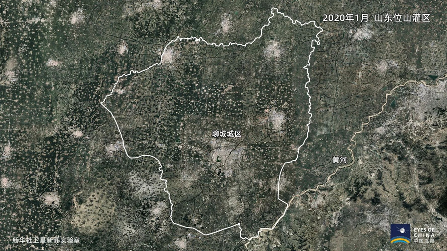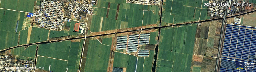高分辨率卫星影像中的位山灌区,水渠、农田、村庄、小镇以及连片的光伏板,构成了鲁西大平原上的现代农业产区景观。