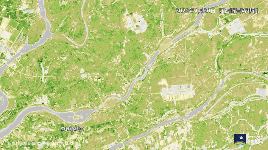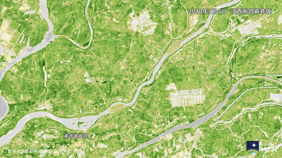 蒋巷镇所在的鄱阳湖平原,稻田、菜畦、鱼塘、莲湖纵横交错,是江南的粮仓,也是棉花、油料、生猪等的重要生产基地。从上面两张相距一个半月的卫星图对比可见,这一区域既有叶绿素水平提升、绿色渐浓的夏收作物地块,也有春播农田——它们在卫星遥感观测中,因翻地、放水泡田而显示为更加明显的灰色。