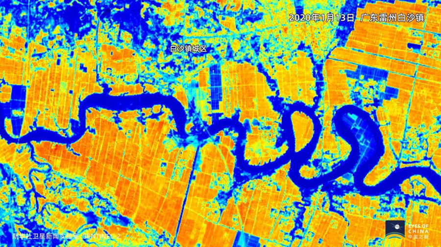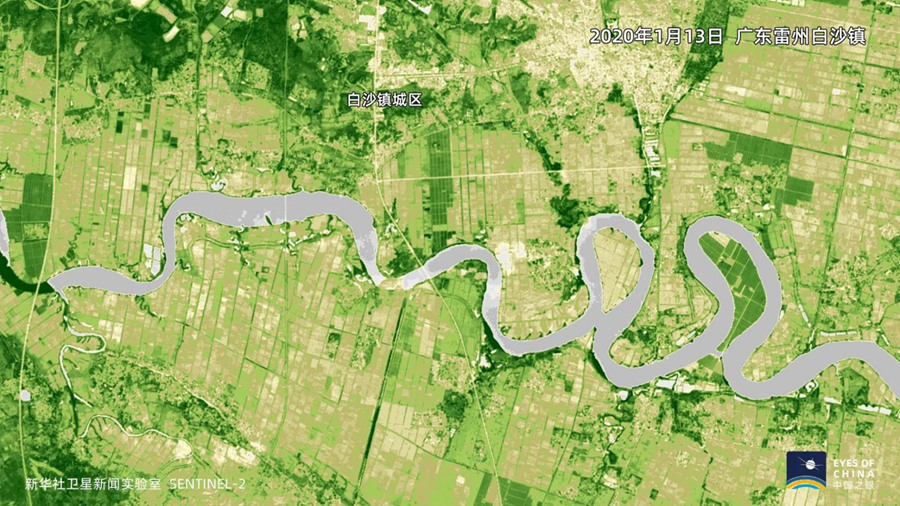 从上面两张卫星图对比可见,相较于1月中旬,雷州农田灰色的水面反射面积明显扩大。