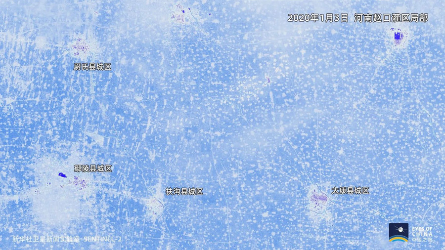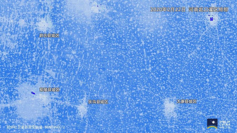 卫星遥感技术不仅可观测土壤含水量,也能有效发现植物含水量的变化。遍布冬小麦农田的赵口灌区,春灌开始后地面植物含水量明显提升,显示为更浓郁的蓝色。