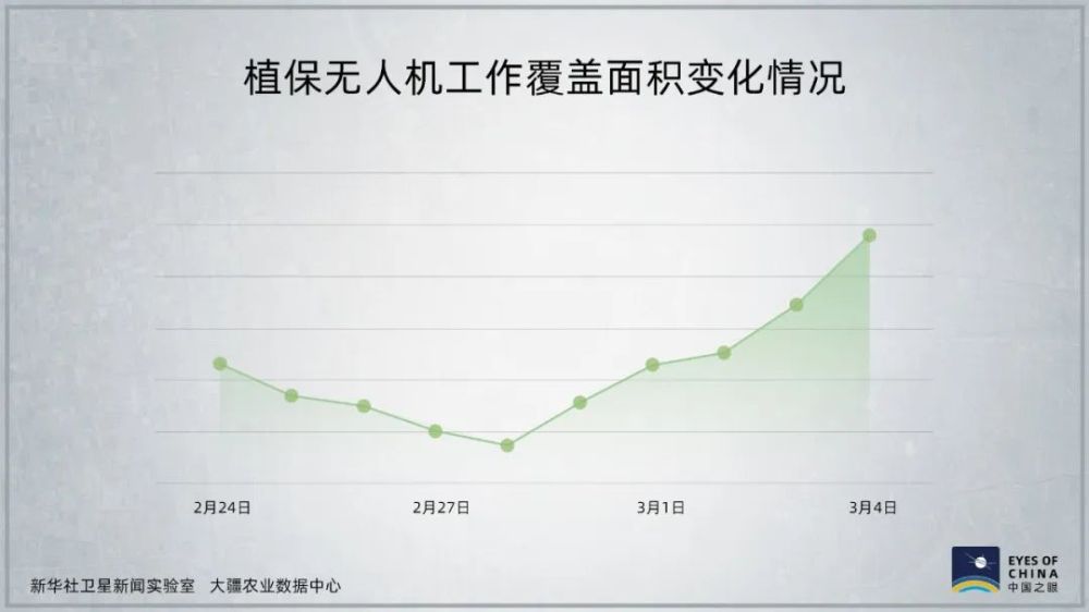 随着疫情防控进入稳定状态,从2月下旬开始,大部分之前进行防疫消杀的植保无人机也转向农业生产,工作覆盖面积自2月底开始快速扩大。