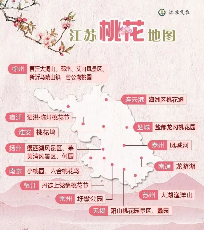 【苏州】本月中旬后期将迎来桃花的初花期,今年盛花期则预计在3月22~23日前后,且将持续至4月6日前后。预计今年苏州的桃花花期较往年约提前4~6天。