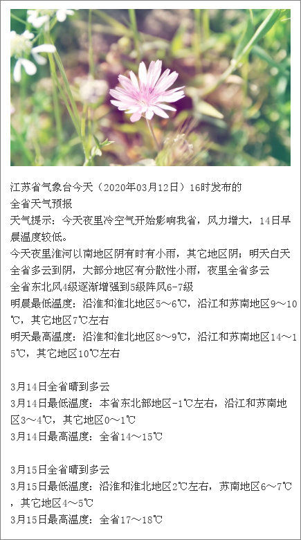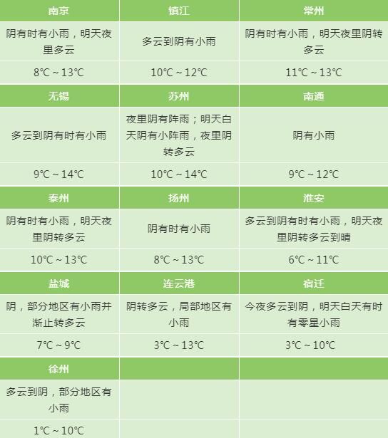 明天最高温度:沿淮和淮北地区8~9℃,沿江和苏南地区14~15℃,其它地区10℃左右