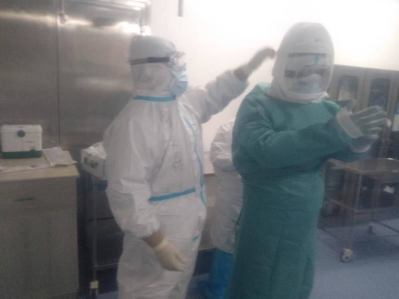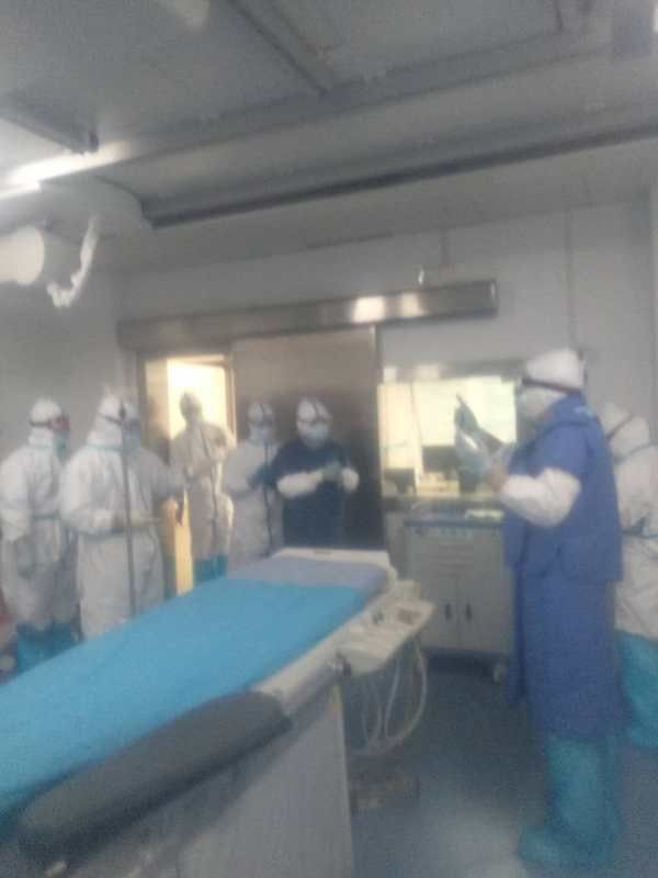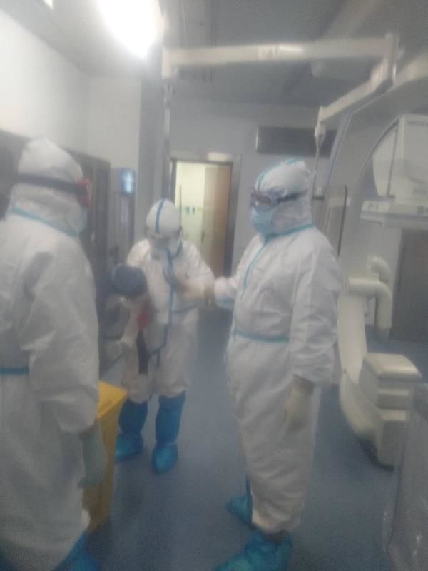 3月9日下午,武汉市汉口医院心内科、麻醉科、感控办、放射科、导管室、消毒供应中心等多科室医护人员“全副武装”,从患者接诊到术前准备,再到手术中及术后转运,全体医护人员在国家卫健委医政医管局新冠肺炎感控专家、江苏省人民医院(南京医科大学第一附属医院)感染管理办公室陈文森主任医师的全程督导下,首次模拟了为一位新冠肺炎伴突发心梗患者开展冠脉介入紧急手术的全过程。