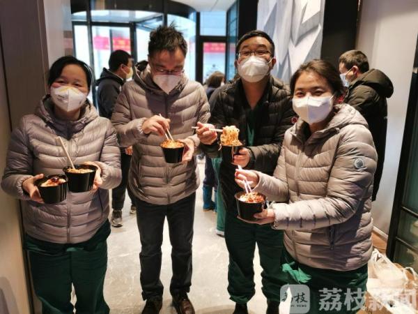 “今天终于吃上传说中的热干面啦!”3月9日,在医疗队驻地,工作人员和当地热心群众一起为医疗队员们准备了武汉名小吃。如东县人民医院呼吸内科副主任医师缪亚琴一手举着热干面,一手向手机镜头比了个V字,随后开心地把照片发给后方家人。倪晓辉告诉记者,从2月9日抵达武汉开始,队员们的生理和心理都承受着巨大压力,所以在饮食方面,他会尽量安排适合队员口味清淡的江浙菜。“队里大多数人都是第一次来武汉,对樱花、黄鹤楼、热干面这些‘打卡’项目都很向往,但队员们都知道疫情还没结束,所以自觉呆在酒店不外出。可风景不能看,热干面却可以吃起来啊,我联系了认识的武汉当地人想问哪里可以弄到热干面,没想到他们特别热心,免费为我们送来了面条和所有调味品,宾馆工作人员也来帮忙,帮我们把热干面给做起来了。”“打卡成功,热干面太好吃了!”队员们纷纷点赞道。