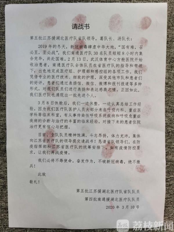 “目前,全队队员精神饱满,斗志昂扬,体力充沛,集体向江苏省医疗队领导提交请战书! 我们必将不辱使命,奋发作为,不破新冠病毒,绝不撤兵!”11日,南通市第二人民医院呼吸内科副主任医师倪晓辉将一张《请战书》递交到江苏省医疗队,薄薄的纸张上文字激昂,30个饱含激情的红手印力透纸背。