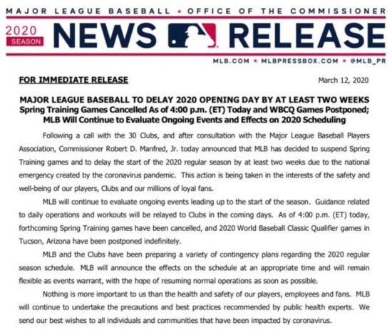 据悉,MLB在发布声明前与30支球队通过电话并与球员工会协商联合做出这一决定,新赛季揭幕战原定于3月27日打响,。