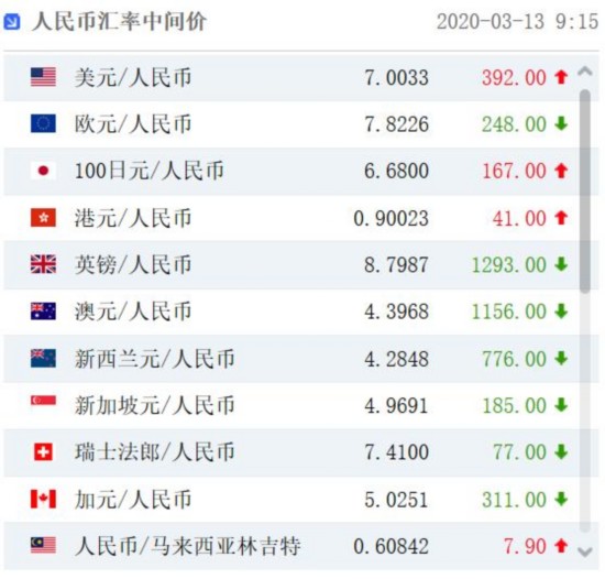 中新经纬客户端3月13日电 中国外汇交易中心数据显示,13日,人民币兑美元中间价调贬392个基点,报7.0033,本周累计调贬696个基点。