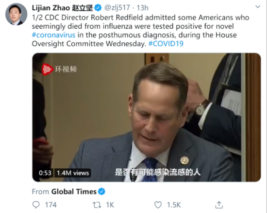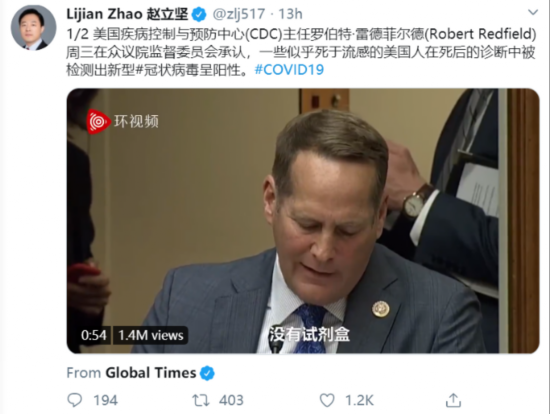 赵立坚12日晚在推文中写道:“美国疾病控制与预防中心(CDC)主任(Robert Redfield)周三在众议院监督委员会承认,一些似乎死于流感的美国人在死后的诊断中被检测出新型#冠状病毒呈阳性。”
