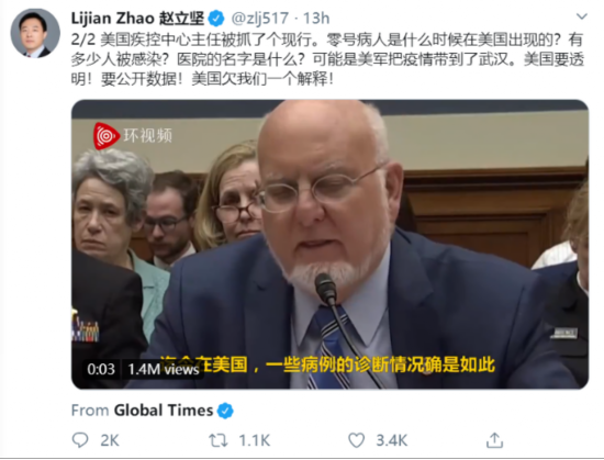 他进一步表示:“美国疾控中心主任被抓了个现行。零号病人是什么时候在美国出现的?有多少人被感染?医院的名字是什么?可能是美军把疫情带到了武汉。美国要透明!要公开数据!美国欠我们一个解释!”