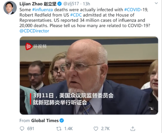 【环球网综合报道】美国疾控中心主任罗伯特·雷德菲尔德在3月11日举行的众议院听证会上首次承认“一些‘流感’死者可能实患新冠肺炎”后,第二天,中国外交部发言人赵立坚12日晚在推特上用中英双语连发5条推文“怒怼”美国:“美国疾控中心主任被抓了个现行。‘零号病人’是什么时候在美国出现的?欠我们一个解释!”