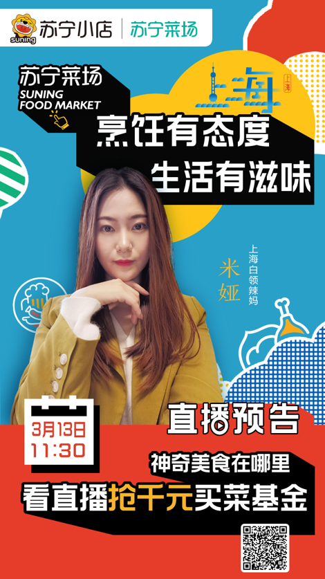 一日三餐,柴米油盐酱醋茶,是我们每一个人都离不开的讨论话题。3月13日,苏宁小店力邀来自北京、上海、南京的三位美食达人,来一场说走就走的“吃货之旅”。此外,观看直播还可获得专属优惠——千元买菜基金免费送,承包你一个月的“伙食费”。