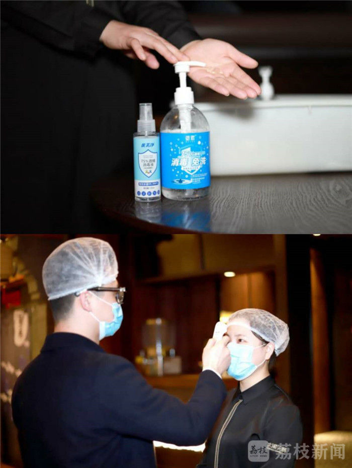 1.经过电子健康通行证安全认证以后,为顾客测温同时还为顾客的手部消毒。