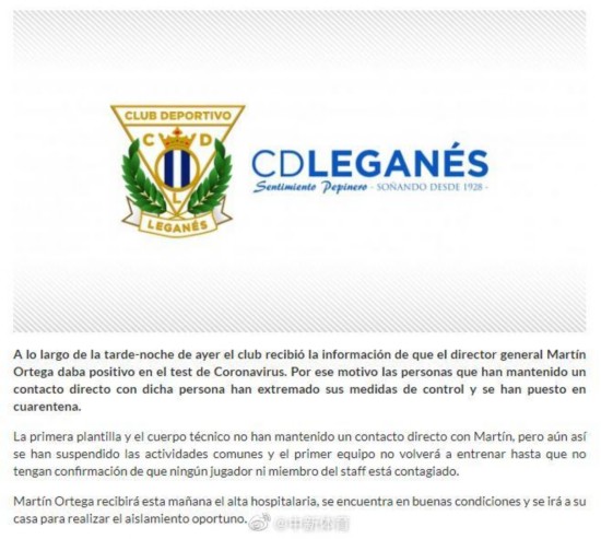 3月13日,西甲球队莱加内斯发布公告,球队CEO奥特加新冠病毒检测呈阳性,与他有过密切接触的人员都被隔离。