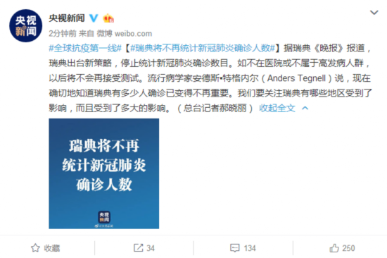 据瑞典《晚报》报道,瑞典出台新策略,停止统计新冠肺炎确诊数目。如不在医院或不属于高发病人群,以后将不会再接受测试。流行病学家安德斯 特格内尔(Anders Tegnell)说,现在确切地知道瑞典有多少人确诊已变得不再重要。我们要关注瑞典有哪些地区受到了影响,而且受到了多大的影响。