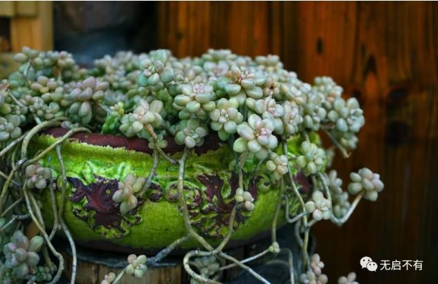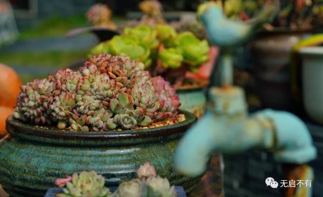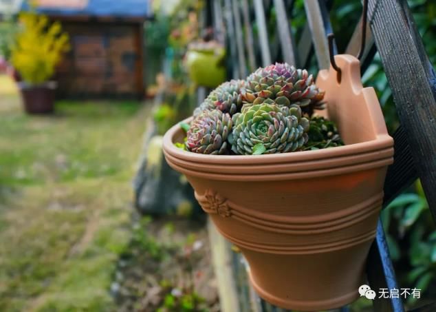 北侧则是三层的阶梯式花坛。阶梯上排满一盆盆女主人酷爱的多肉,色泽形态各异。