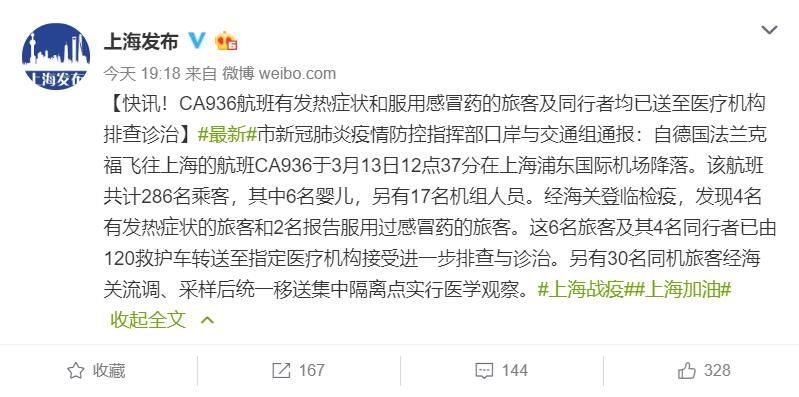 荔枝新闻讯 上海市新冠肺炎疫情防控指挥部口岸与交通组通报:自德国法兰克福飞往上海的航班CA936于3月13日12点37分在上海浦东国际机场降落。该航班共计286名乘客,其中6名婴儿,另有17名机组人员。经海关登临检疫,发现4名有发热症状的旅客和2名报告服用过感冒药的旅客。这6名旅客及其4名同行者已由120救护车转送至指定医疗机构接受进一步排查与诊治。另有30名同机旅客经海关流调、采样后统一移送集中隔离点实行医学观察。