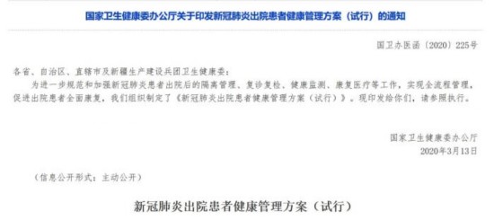 据国家卫健委网站消息,为进一步规范和加强新冠肺炎患者出院后的隔离管理、复诊复检、健康监测、康复医疗等工作,实现全流程管理,促进出院患者全面康复,国家卫生健康委办公厅组织制定了《新冠肺炎出院患者健康管理方案(试行)》。