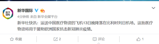 新华社快讯:运送中国医疗物资的飞机13日晚降落在比利时列日机场。这批医疗物资将用于援助欧洲国家抗击新冠肺炎疫情。