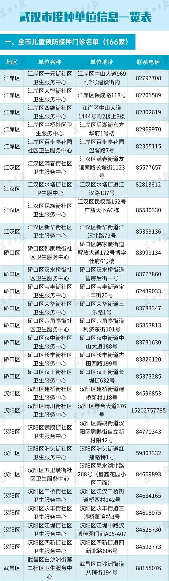 武汉市卫健委官网发布通告,为及时给适龄儿童及成人有序提供预防接种服务,经武汉市新冠肺炎疫情防控指挥部疾病控制组研究,定于3月14日起恢复全市大部分接种门诊的预防接种服务工作,现公布儿童接种门诊点、狂犬疫苗接种点、产科接种点、成人疫苗接种点名单。