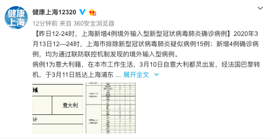 荔枝新闻讯 2020年3月13日12—24时,上海市排除新型冠状病毒肺炎疑似病例15例;新增4例确诊病例,均为通过联防联控机制发现的境外输入型病例。