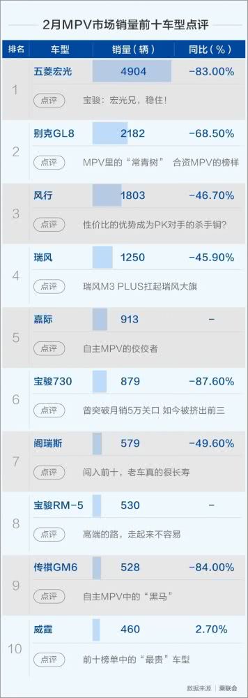 事实上,MPV市场已连续两年下降,市场份额从2017年的8.5%下降到2019年的6.6%。但即便如此,MPV市场的竞争仍未停止。在2月MPV销量前十车型中,自主品牌占据了8个席位。五菱宏光依然位居第一位,风行从1月的第四位上升至第三位,嘉际闯入前十,位居第五,宝骏730、宝骏RM-5排名分别下滑至第六位和第八位,宝骏360跌出前十榜单。