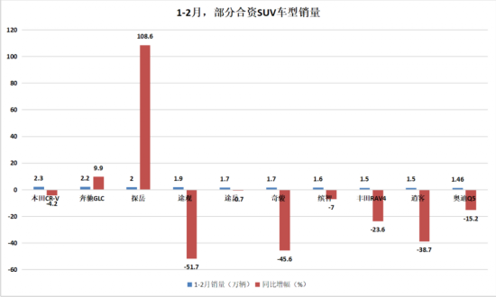 在车市整体下探的背景下,也有部分合资车型因1月表现较好,前两个月累计销量出现上升。如,奔驰GLC累计销量为2.2万辆,同比提升9.9%;探岳累计销量为2.2万辆,同比上涨108.6%;途岳累计销量1.7万辆,同比轻微下跌;东风本田CR-V累计销量2.3万辆,同比下滑4.2%。