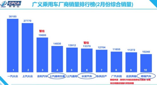 乘联会发布的狭义乘用车厂商销量排行榜(2月份批发销量)显示,在合资车企2月批发销量前十强中,一汽-大众以2.2万辆的成绩占据榜首,东风日产紧随其后。从1-2月的累计销量来看,一汽-大众依然以20.7万辆的成绩保持着冠军地位,身为亚军和季军的上汽通用和上汽大众,二者之间相差1万辆的销量,上汽通用五菱以9万辆的成绩在销量排行榜中排名第六位。