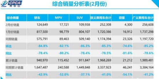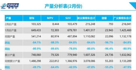 乘联会最新数据显示,2月国内狭义乘用车综合产销量分别约为21.52万辆和25.23万辆,同比分别下降80.6%和78.5%。1-2月,国内狭义乘用车综合销量约为196.83万辆,同比下降41%。