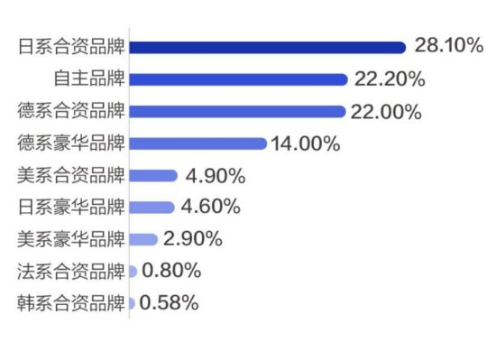 在汽车品牌选择上,日系合资品牌购买意愿度最高,德系合资品牌和自主品牌次之。此外,不少消费者对德系豪华品牌也有较强的购买意愿。