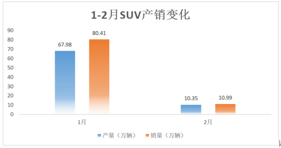 乘联会数据显示,2月,SUV产销量分别约为10.35万辆和10.99万辆,同比分别下滑78.8%和78.4%,环比分别下滑84.8%和86.3%;1-2月,SUV累计完成产销量分别约为77.99万辆和91.18万辆,同比分别下滑42.9%和37.1%。尽管销量大幅下滑,但在各大汽车细分市场中,SUV的下滑幅度最小。