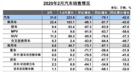 据中国汽车工业协会(以下简称中汽协)最新数据,2月,我国汽车产销量分别为28.5万辆和31万辆,同比分别下滑79.8%和79.1%;前两个月,我国汽车产销量累计分别完成204.8万辆和223.8万辆,同比分别下滑45.8%和42%。