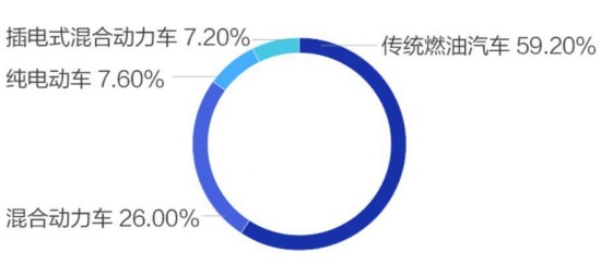 在传统燃油车和新能源车的选择上,有六成消费者选择了传统燃油车。此外,消费者对混合动力车型的购买意愿在新能源车中占比最高。