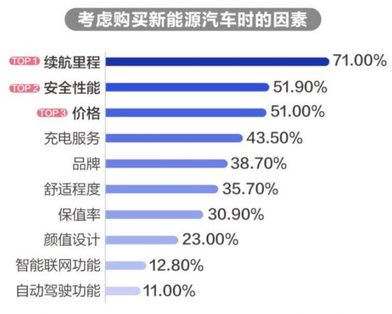 调查显示,在考虑购买新能源汽车时,续航里程、安全性能和价格是消费者最看重的三大因素,分别占比71%、51.9%和51%,在很大程度上决定着购买行为。此外,充电服务和品牌要素也较为重要,分别占比43.5%和38.7%。