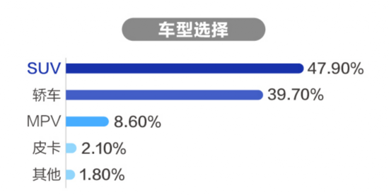 消费升级是购车的主要趋势之一。调查显示,20万-30万元价位区间车型成为消费者的主流选择,仅有不足10%的消费者会考虑购买10万元以下车型。在车型选择方面,SUV成为购买意愿度最高的车型,轿车紧随其后。