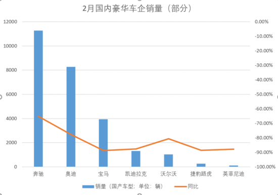 在国内豪华车第一阵营中,奔驰、宝马和奥迪2月的国产车型合计销量约2.35万辆。而去年同期,三家豪华车企在华单月销量均超过了4万辆。国内豪华车第二阵营中,凯迪拉克和沃尔沃的国产车型2月销量均超过千辆,同比下滑幅度超过八成。