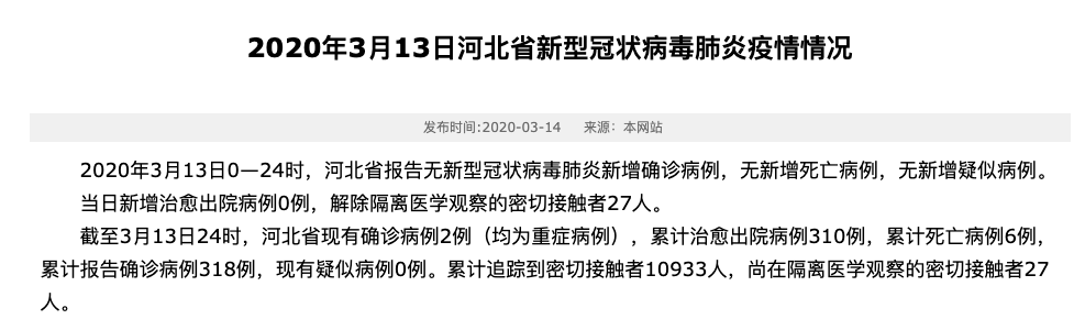 截至3月13日24时,河北省现有确诊病例2例(均为重症病例),累计治愈出院病例310例,累计死亡病例6例,累计报告确诊病例318例,现有疑似病例0例。累计追踪到密切接触者10933人,尚在隔离医学观察的密切接触者27人。
