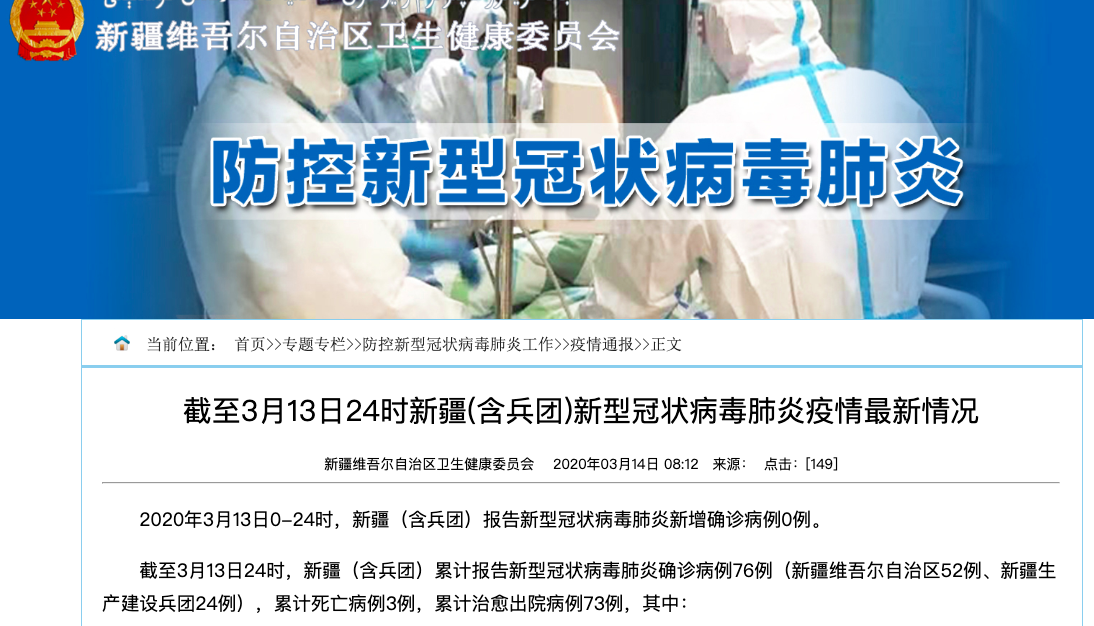 截至3月13日24时,新疆(含兵团)累计报告新型冠状病毒肺炎确诊病例76例(新疆维吾尔自治区52例、新疆生产建设兵团24例),累计死亡病例3例,累计治愈出院病例73例,其中: