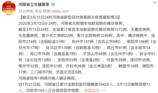 截至3月13日24时,全省累计报告本地新冠肺炎确诊病例1272例,无重症病例,无危重病例,累计死亡病例22例,累计出院病例1249例。其中:确诊病例中,信阳市274例(含固始县31例)、郑州市157例(含巩义市9例)、南阳市156例(含邓州市17例)、驻马店市139例(含新蔡县10例)、商丘市91例(含永城市14例)、周口市76例(含鹿邑县7例)、平顶山市58例(含汝州市1例)、新乡市57例(含长垣市13例)、安阳市53例(含滑县2例)、许昌市39例、漯河市35例、焦作市32例、洛阳市31例、开封市26例(含兰考县5例)、鹤壁市19例、濮阳市17例、三门峡市7例、济源示范区5例。