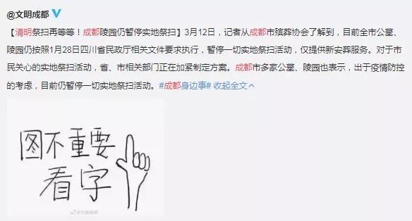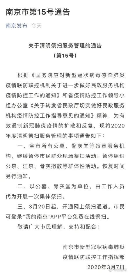 3月7日,@南京发布 通告,暂停清明现场祭扫活动。全市所有公墓、骨灰堂等殡葬服务机构,继续暂停市民群众现场祭扫活动等;以公墓、骨灰堂为单位,由工作人员代为开展一次集体祭扫;3月20日起,开通线上祭扫通道。